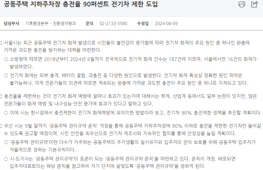 최근 서울시에서 제시한 ‘공동주택 지하주차장 충전율 90퍼센트 전기차 제한’이라는 새로운 규제 방안이 화제를 모으고 있다.